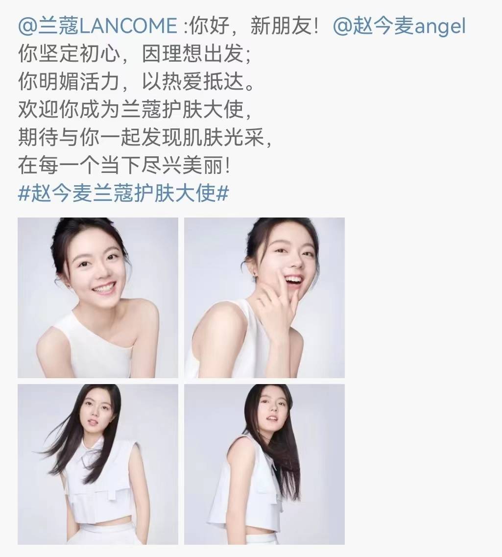 今日蘭蔻官宣護(hù)膚大使趙今麥明星代言公司),吸引了不少人關(guān)注。趙今麥穿著舒適簡單,和蘭蔻凈澈透亮的特質(zhì)非常貼合,作為全球知名的高端化妝品品牌,蘭蔻涉足護(hù)膚、彩妝、香水等多個(gè)產(chǎn)品領(lǐng)域,也看中了趙今麥身上質(zhì)感高級(jí)、風(fēng)格多變的特點(diǎn),這次合作也是皆大歡喜的。