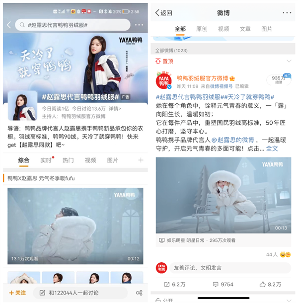 官宣當天不到5小時, #趙露思代言鴨鴨羽絨服#的話題閱讀量破億,官博微博閱讀量近1000萬。雙方在立冬后第一天的強強聯(lián)合,為寒冷的冬天帶來了暖意。