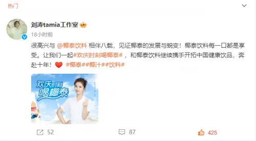 7月25日,著名影視演員劉濤(明星代言公司)在其工作室微博上官宣了繼續(xù)擔任椰泰椰汁品牌形象大使的信息,并發(fā)布了一段動態(tài):“和椰泰飲料繼續(xù)攜手開拓中國健康飲品,奔赴十年”。