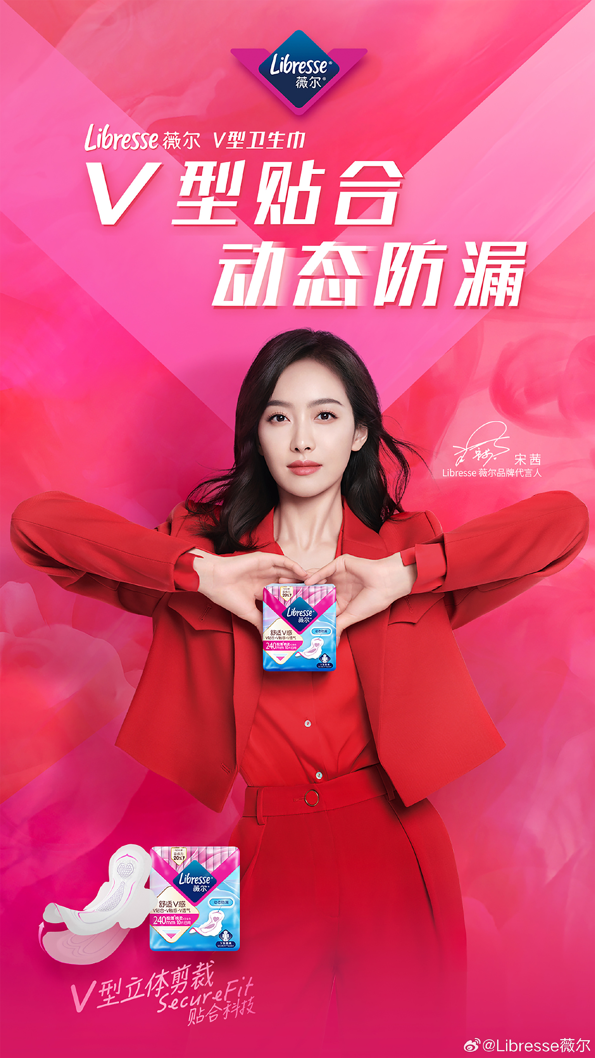 5 月 28 日是國際月經(jīng)日,衛(wèi)生巾品牌 Libresse 薇爾官宣宋茜(明星代言公司)為品牌代言人。當下品牌衛(wèi)生巾總是以直線思維設(shè)計衛(wèi)生巾,卻未考慮女性身材的曲線需求,為此二者合作發(fā)布廣告片,為女性被忽視的 V 型曲線發(fā)聲——看見女性女性經(jīng)期的真實需求線,一起感受薇爾 V 型衛(wèi)生巾的全新升級,用 V 型貼合動態(tài)防漏的品牌賣點讓女性經(jīng)期不再出漏子。