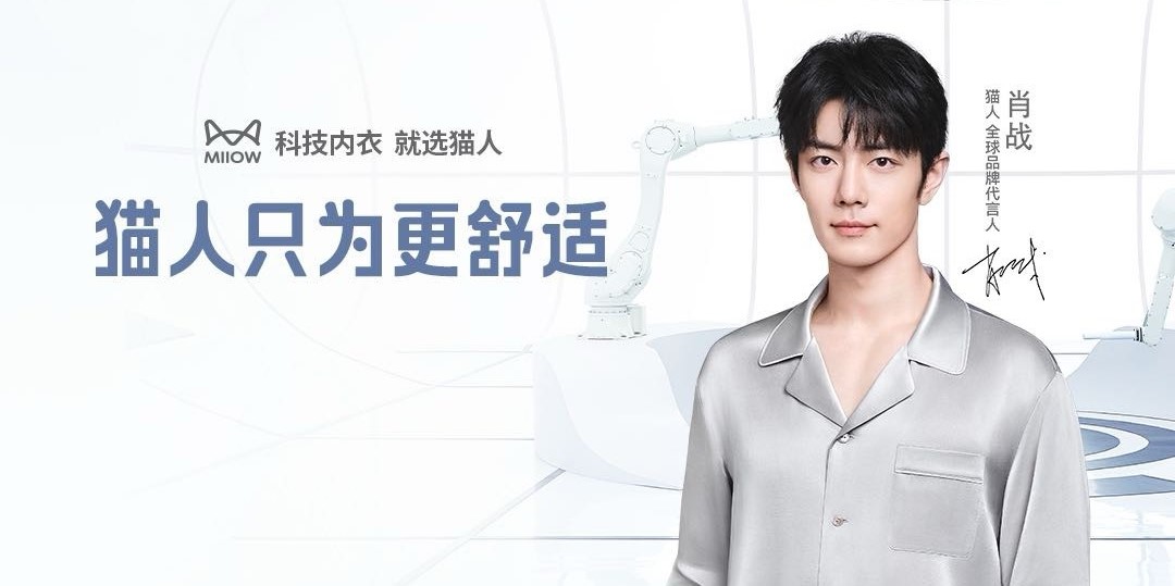 3 月 30 日,貓人官宣肖戰(zhàn)(明星代言公司)為全球品牌代言人,二者共同發(fā)布品牌科技宣傳大片,肖戰(zhàn)身著品牌仿絲家居服及水光 T...