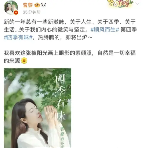 8月4日,曾黎(明星經(jīng)紀(jì)公司)在社交媒體平臺上發(fā)文稱:“品嘗過酸甜苦辣,就能懂得人生如同四季。新書上線倒計時3天”,官宣新書。