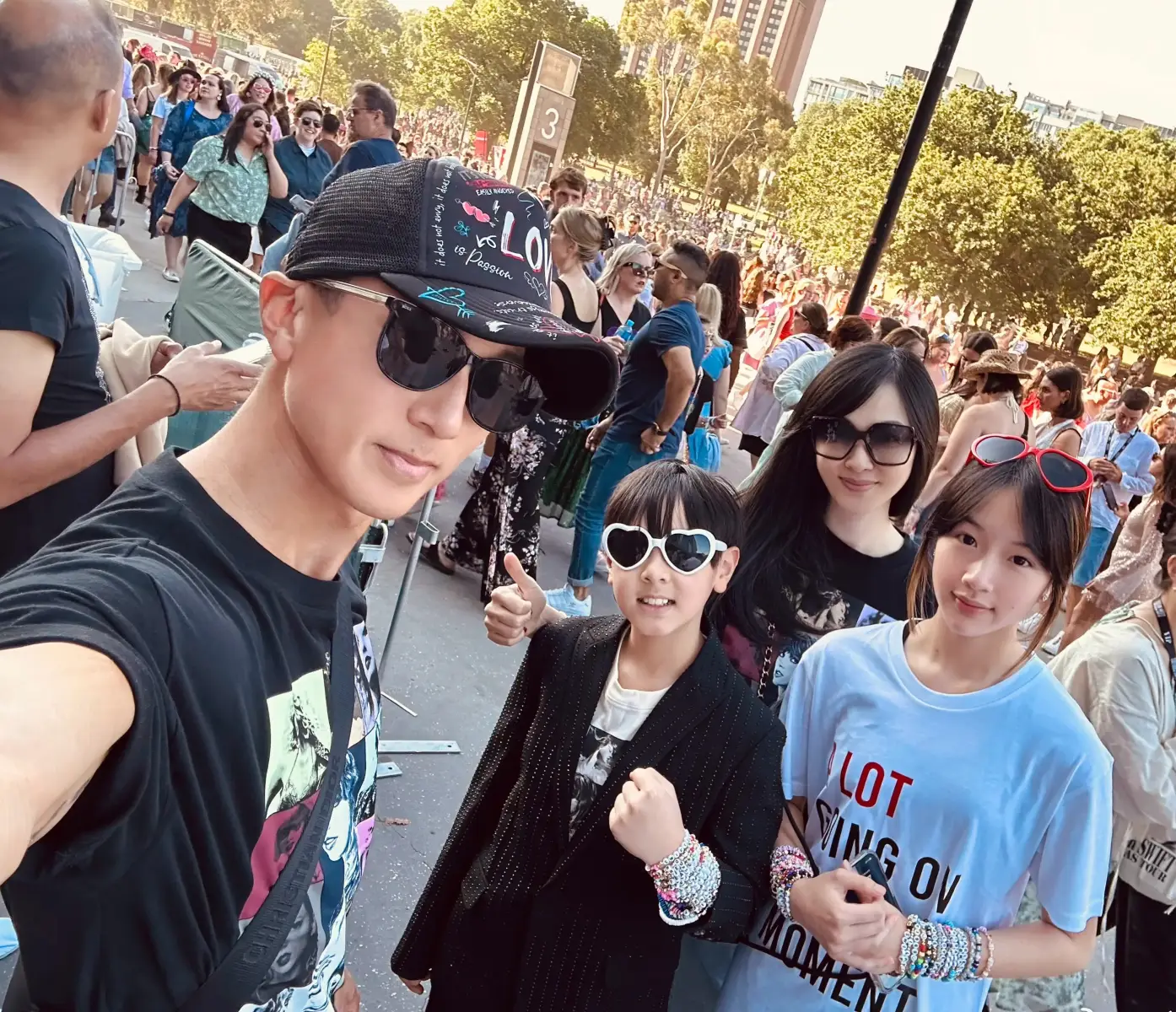 2月18日,吳尊(明星經紀公司)在社交平臺曬出全家一起看霉霉演唱會的照片,照片里一家四口站在場館外排隊,氛圍超好。