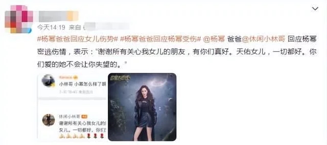 自從楊冪受傷后,粉絲們對她保持著高度關(guān)注,四處詢問她的近況,還有無數(shù)粉絲追問了楊冪父親的社交賬號。