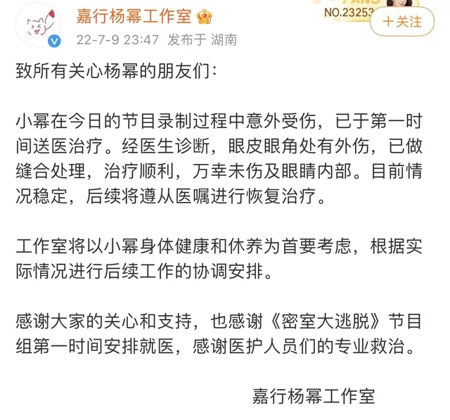 無數(shù)網(wǎng)友都在探尋著消息是否屬實、楊冪受傷是否嚴重,而楊冪(明星經(jīng)紀公司)工作室隨后發(fā)文證實了這件事,表示楊冪的眼角處有外傷,不過幸好沒有傷及到眼睛內(nèi)部。