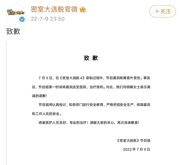 7月9日,楊冪錄制《密室大逃脫》意外受傷的消息沖上熱搜,隨后引起熱議。