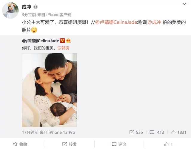 照片中,韓庚握著新生兒的手,笑容滿面地看著孩子,而妻子盧靖姍則抬頭親吻老公的臉頰,真是隔著屏幕都能感受到有多甜。