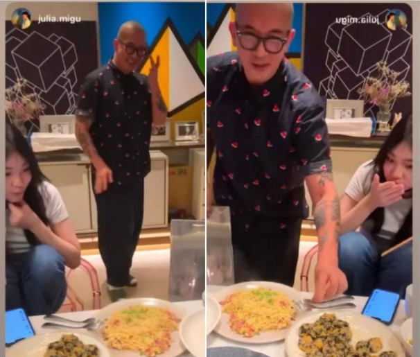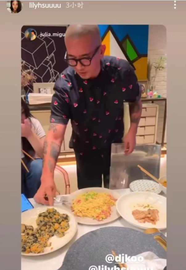 視頻當中大S的老公具俊曄身穿西瓜印花的T恤,戴黑色鏡框,為Lily準備好炒飯,甚至貼心將餐具擺在餐盤邊上。而Lily這邊似乎在吃什么東西,看到姨夫親自給自己端盤,有些不知所措,慌忙道謝。