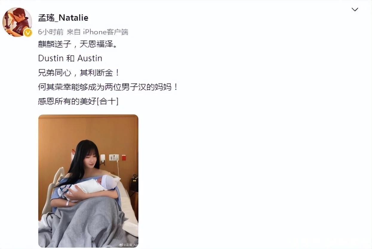 9月15日,39歲的“晶女郎”孟瑤(明星經(jīng)紀公司)在社交平臺上曬照官宣產(chǎn)子,這是她的第二個孩子,也就是和現(xiàn)任男友的第一個孩子,此前她就有一個大兒子名叫Dustin,二兒子她起名為Austin,她也是配文稱:“麒麟送子,天恩福澤。Dustin 和 Austin 兄弟同心,其利斷金!何其榮幸能夠成為兩位男子漢的媽媽!感恩所有的美好”可見她對于孩子的到來是感受到滿滿的幸福。