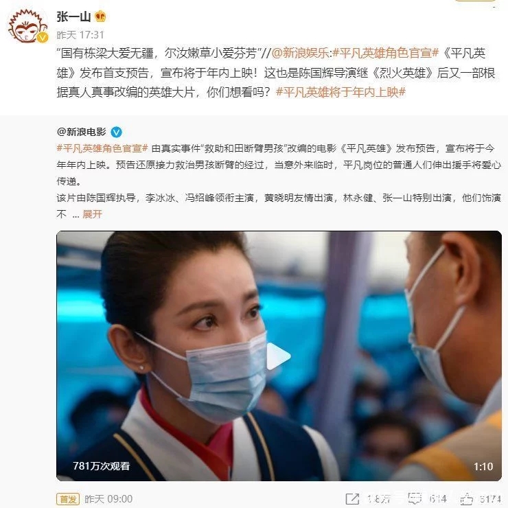 2022年9月20日下午,張一山(明星經(jīng)紀(jì)公司)轉(zhuǎn)發(fā)了一條微博,幫助宣傳李冰冰(明星經(jīng)紀(jì)公司)、馮紹峰(明星經(jīng)紀(jì)公司)主演的電影《平凡英雄》,算是間接否認(rèn)自己吸毒/嫖娼被抓了。