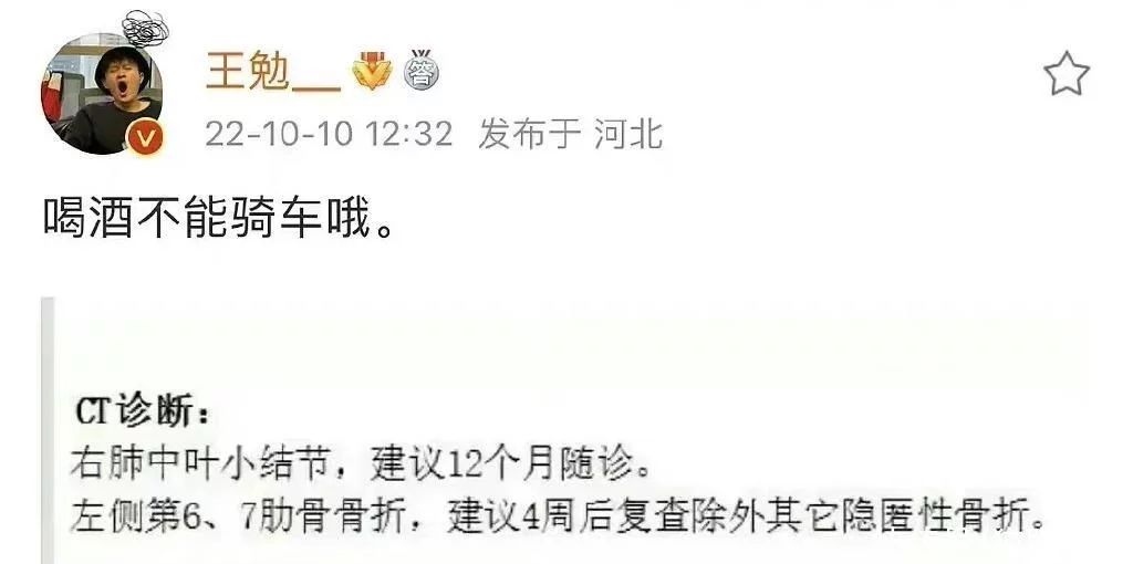10月10日,脫口秀演員王勉(明星經(jīng)紀公司)在社交平臺上曬出一張去醫(yī)院拍CT的診斷結(jié)果圖,并配文稱:“喝酒不能騎車。”從這就能看出他當(dāng)天是在喝完酒后,騎車離開的,沒想到發(fā)生了意外,使他受傷,只不過很快他便刪除了這條動態(tài),可能是覺得有些“丟人”吧!