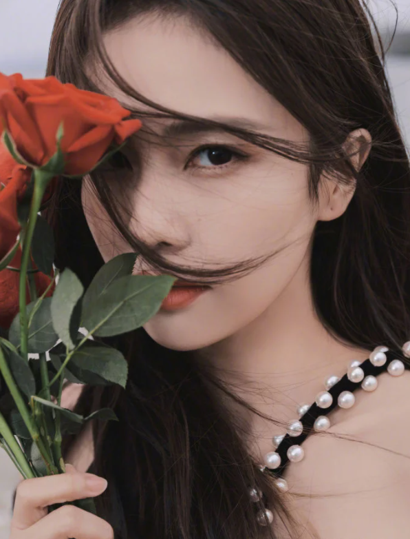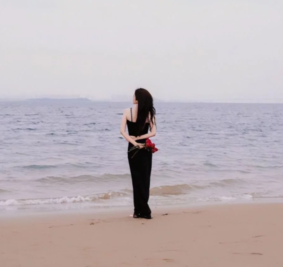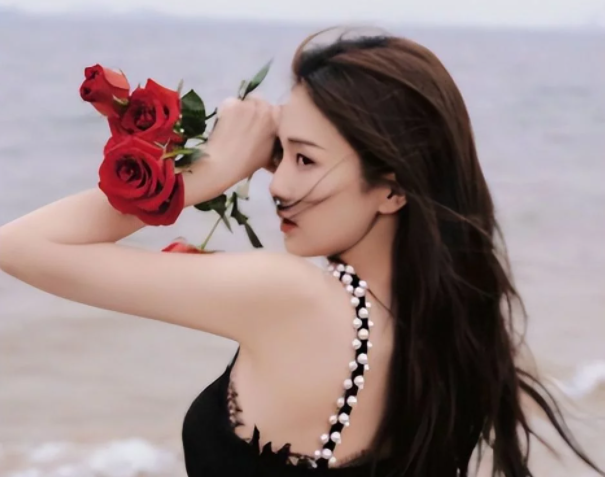 照片中,白鹿身穿露肩黑色吊帶長裙,露出完美的直角肩,幾枝玫瑰握于手中,她一個人站在遼闊的海邊,微側(cè)著頭,海風吹拂過她的臉龐,帶起了海藻般的烏發(fā),紅黑色的碰撞更襯得肌膚白如雪,衣角若隱若現(xiàn)的羽毛蕾絲透著性感,這一刻玫瑰也黯然失色,垂下了高貴的花衣。