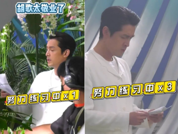 40歲胡歌錄制節(jié)目超認真,埋頭背稿子一臉嚴肅,梳大背頭打扮儒雅