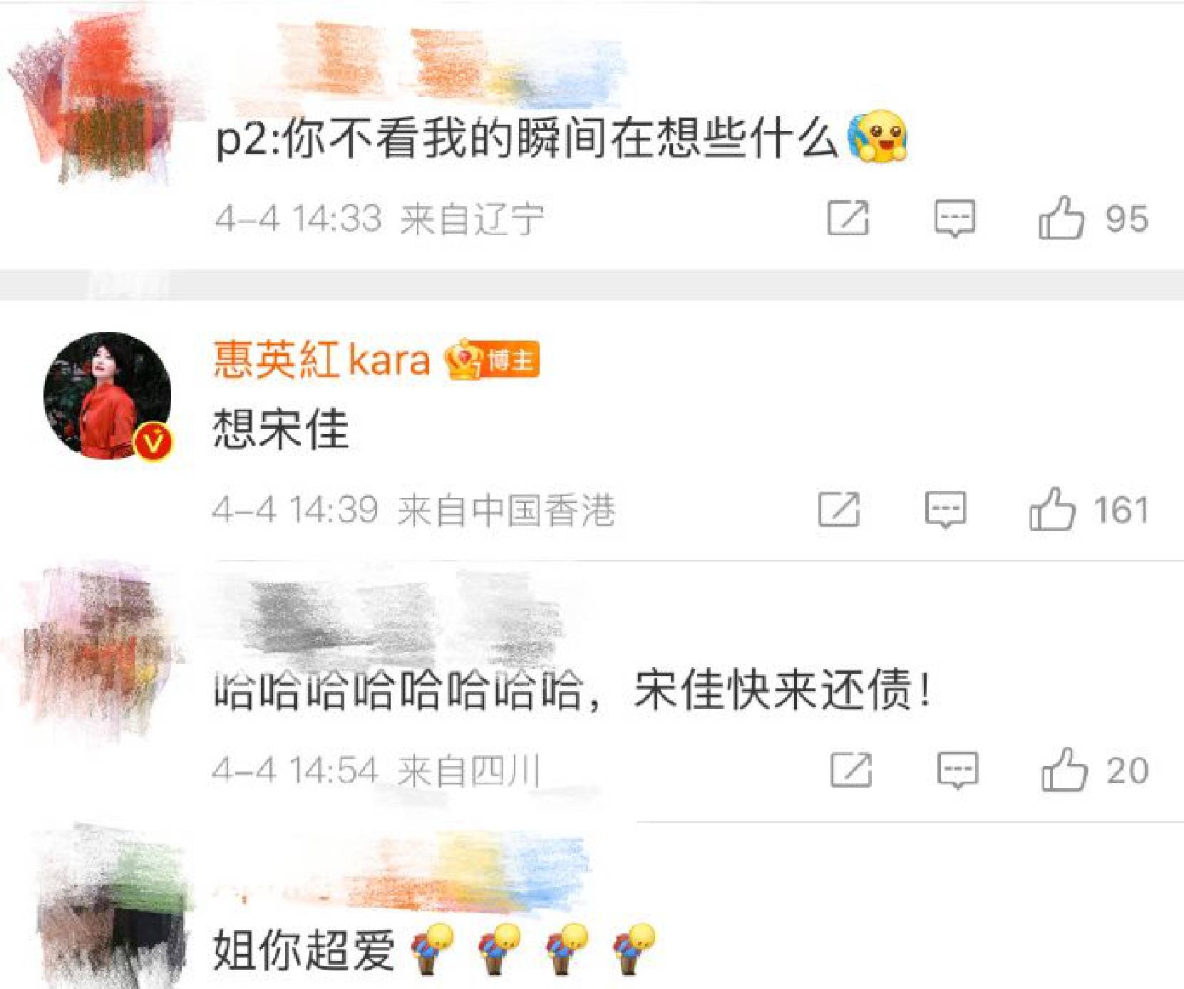 惠英紅(明星經(jīng)紀公司)在線回復(fù)網(wǎng)友評論,網(wǎng)友提問“圖2你不看我的瞬間在想什么”,惠英紅趣味回復(fù)“想宋佳”,二人關(guān)系親密惹人羨慕。