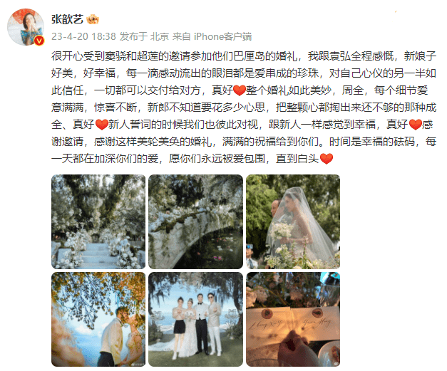 張歆藝還曬出竇驍與何超蓮在繁花中親吻的照片,依稀能看到兩位新人面露甜蜜笑容,畫面幸福有愛!