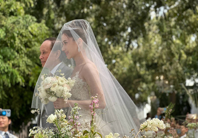 何超蓮身穿婚紗,手拿捧花,走向與竇驍?shù)幕槎Y現(xiàn)場,每一步都十分堅定!
