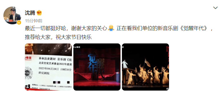 28日,沈騰(明星經(jīng)紀(jì)公司)在社交平臺上發(fā)文回應(yīng)生病傳聞,稱:“最近一切都挺好哈,謝謝大家的關(guān)心,正在看我們單位的新音樂劇《覺醒年代》 ,推薦給大家,祝大家節(jié)日快樂。”