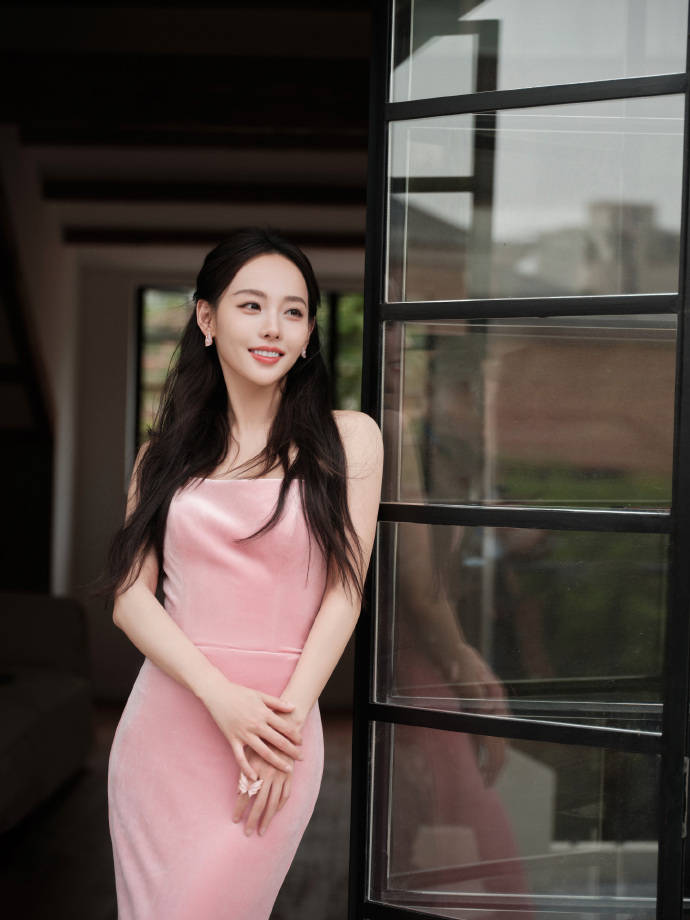 張嘉倪身穿粉色吊帶連衣裙,她俏臉甜美,眉清目秀,唇紅齒白,長發(fā)飄逸,她單手扶著窗戶,曼妙的身材曲線優(yōu)越,微微一笑很傾城!
