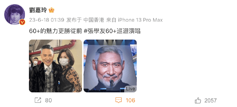 6月18日凌晨,劉嘉玲(明星經(jīng)紀(jì)公司)曬出看張學(xué)友演唱會的照片,表示“60+的魅力更勝從前”。兩人后臺見面、熱情擁抱的視頻也曝光。除了劉嘉玲,曾志偉、杜德偉等明星也都出現(xiàn)在觀眾席。
