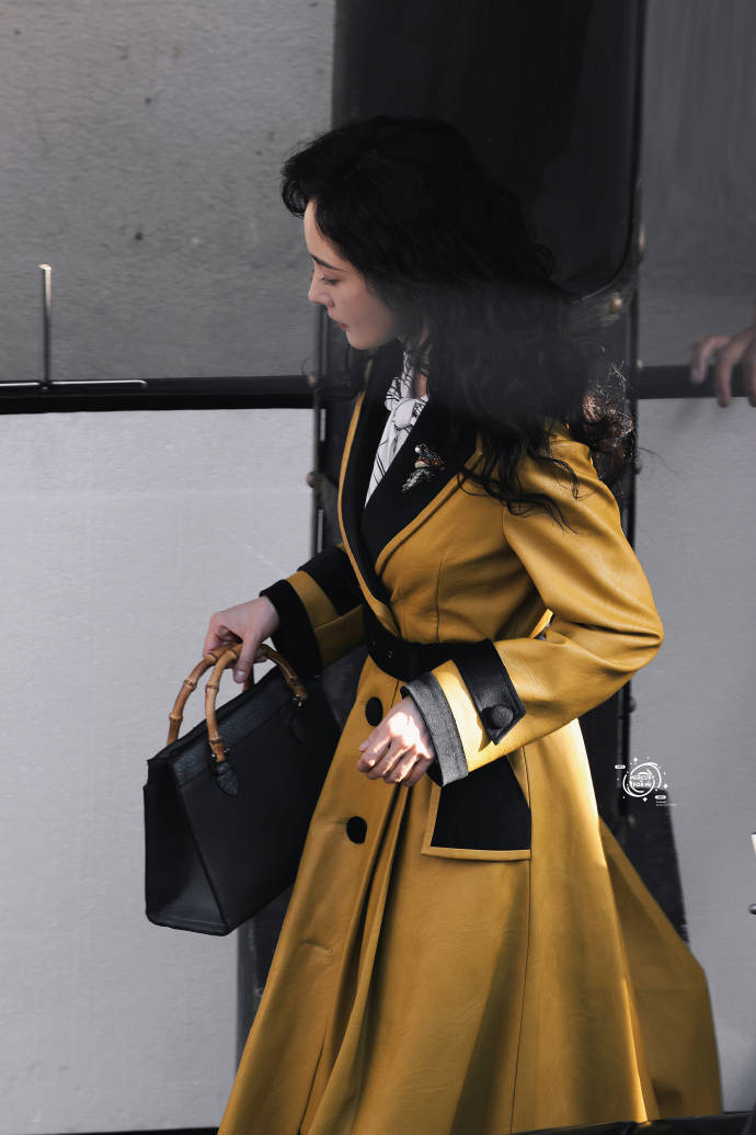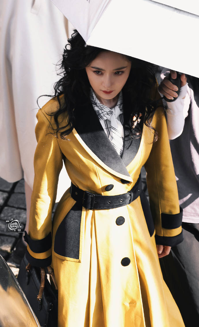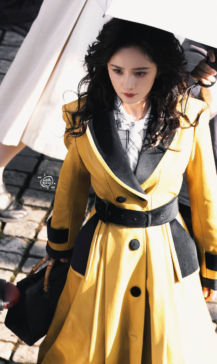 楊冪穿黃色大衣腰肢纖細(xì) 卷發(fā)紅唇造型復(fù)古優(yōu)雅