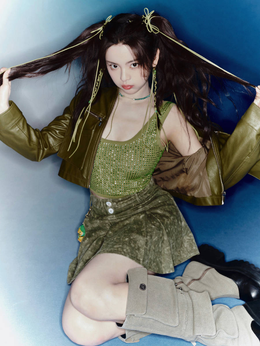 楊超越墨綠風穿搭甜美可愛 頭扎雙馬尾靈動輕盈