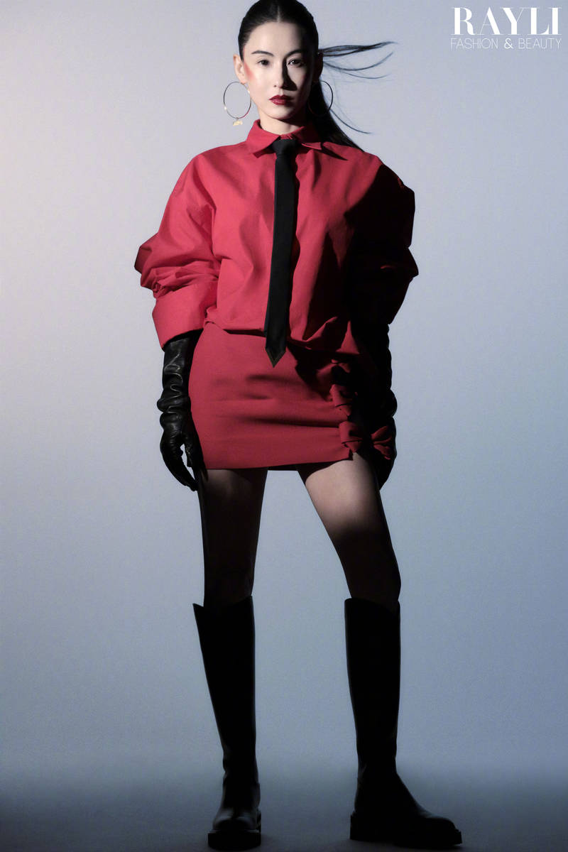 張柏芝身穿利落紅裙,雙腿纖細(xì)。