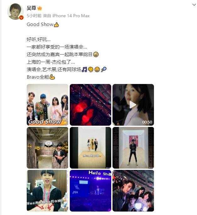 吳尊還發(fā)文稱:“一家都好享受的一場演唱會…還突然成為嘉賓一起跳本草綱目。”