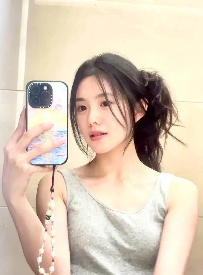 劉浩存對(duì)鏡自拍秀鎖骨。