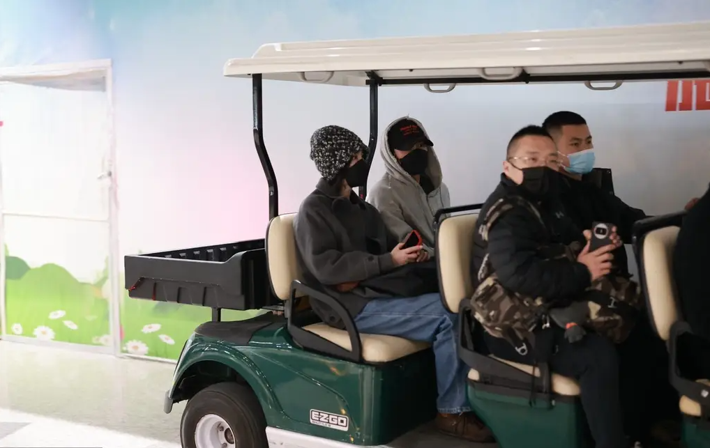 謝霆鋒一身衛(wèi)衣衛(wèi)褲,兩人在擺渡車上閑聊。