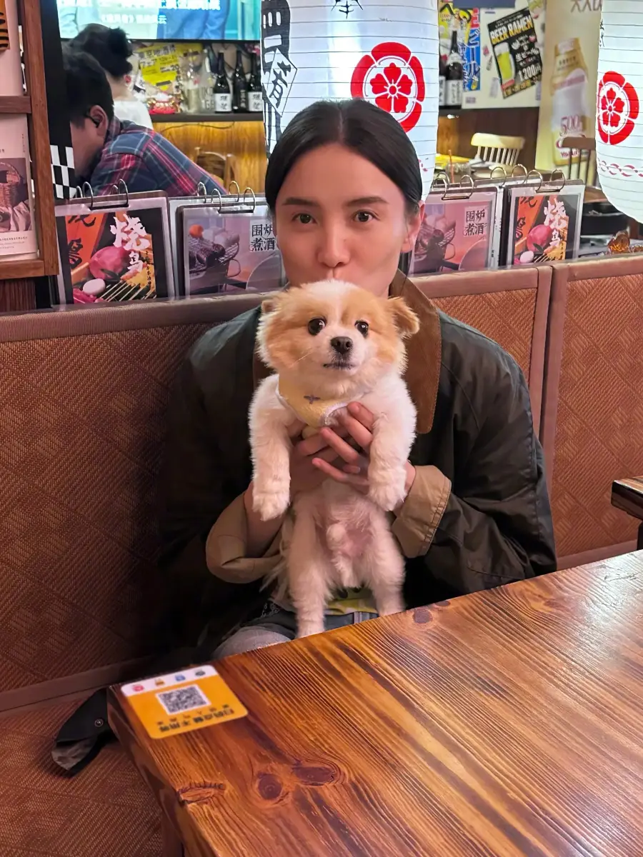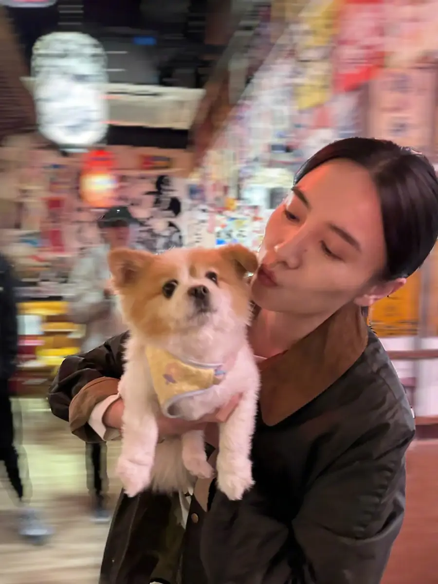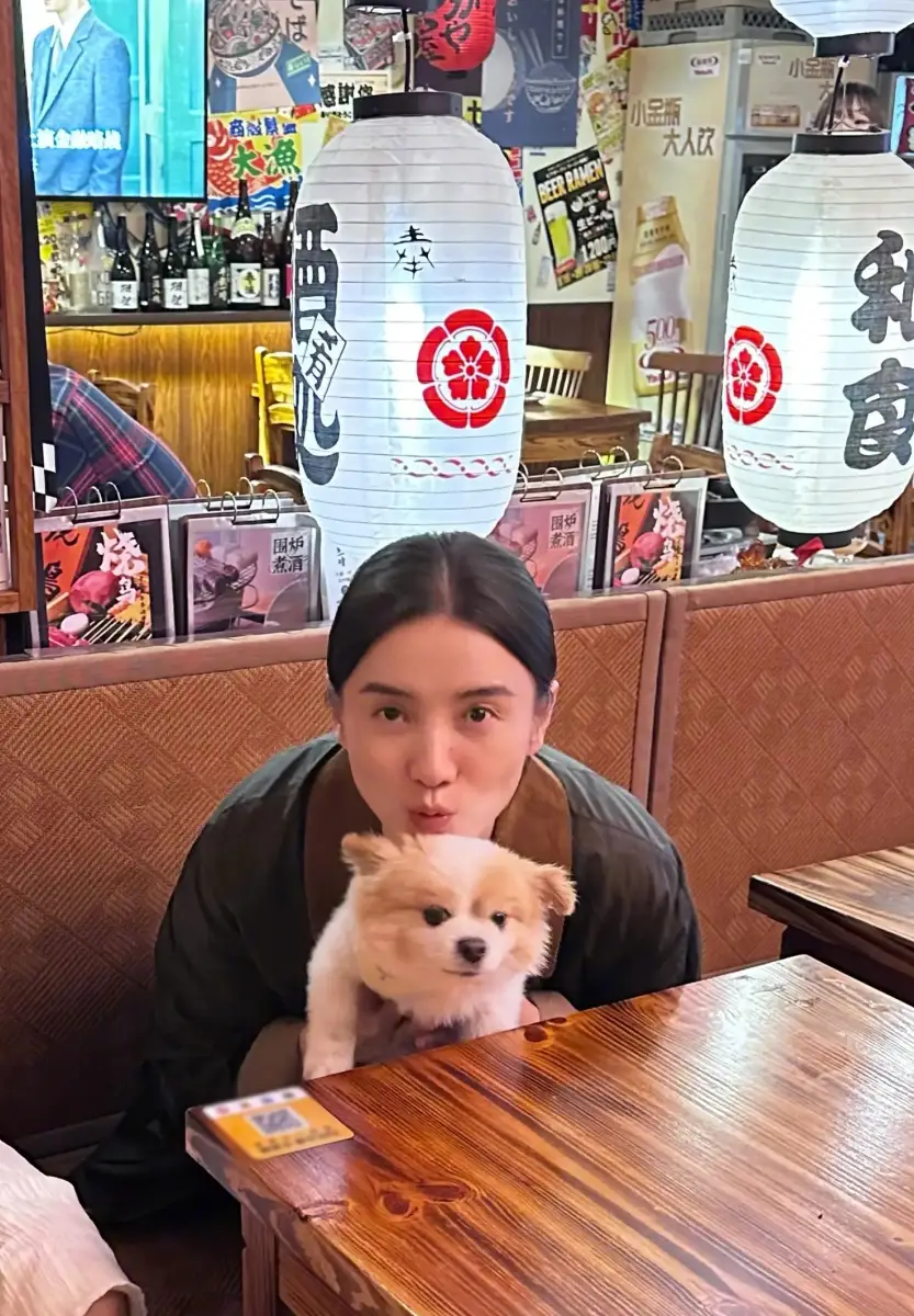 宋佳抱著小狗拍合照,嘟嘴親親,笑容滿面,十分喜愛這只可愛小狗。