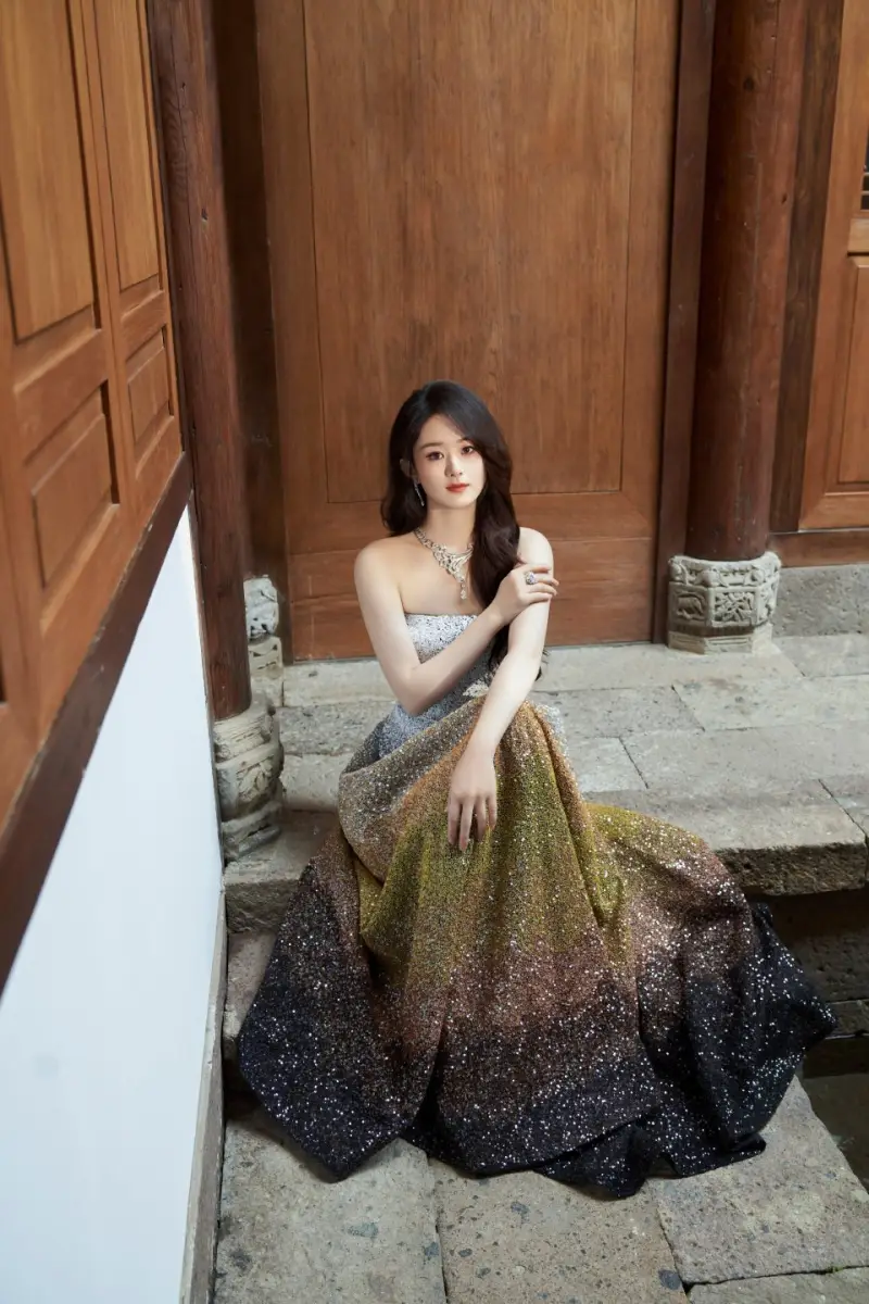 趙麗穎穿銀色閃光抹胸裙 長發(fā)微卷氣質(zhì)典雅似千金