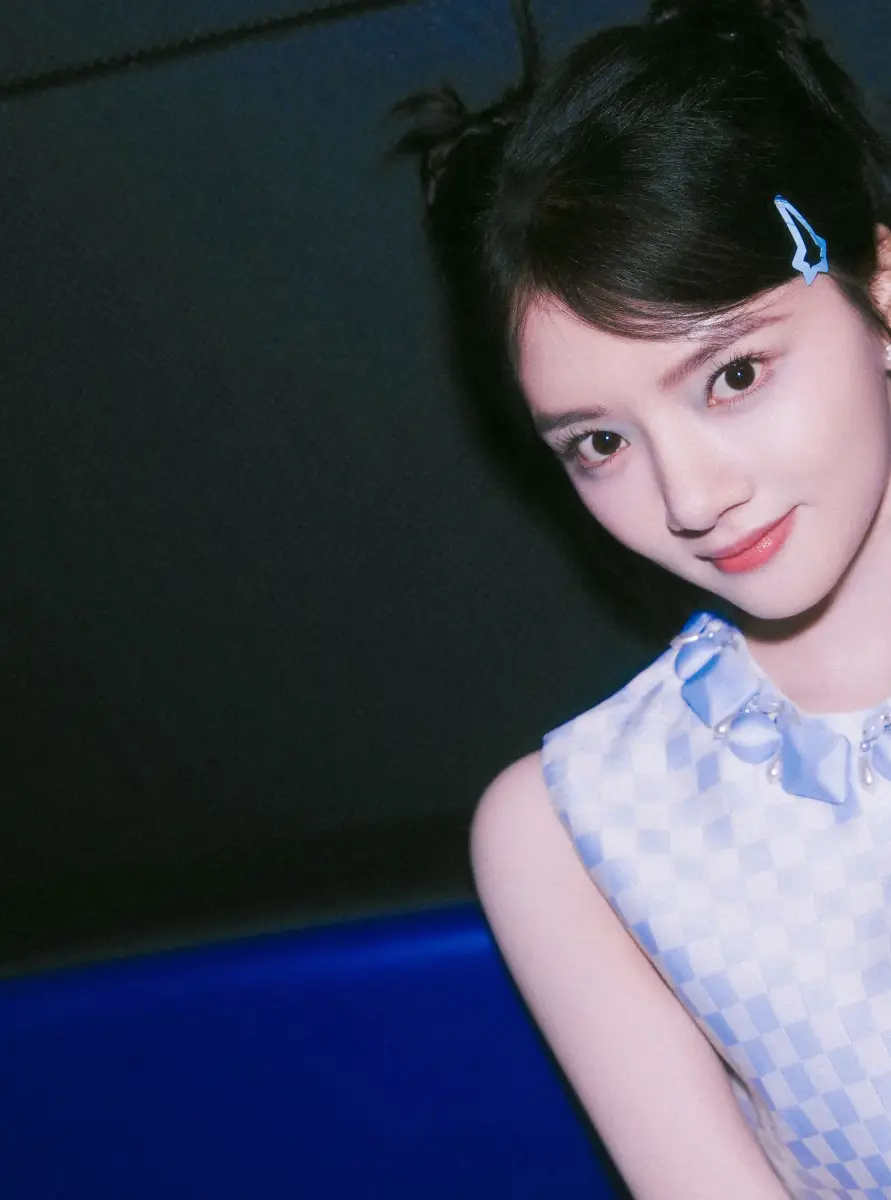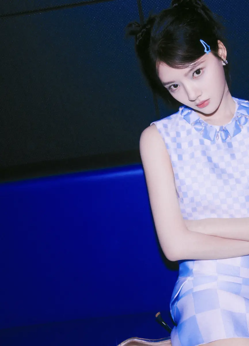 4月17日,任敏穿藍(lán)色無(wú)袖套裝,扎雙丸子頭別發(fā)夾,手托下巴表情靈動(dòng)好俏皮,沙發(fā)上拍照秀盈盈細(xì)腰和一雙修長(zhǎng)美腿。