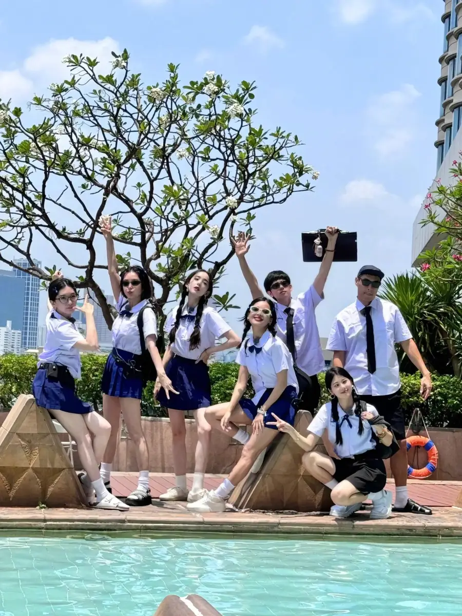 4月18日,綜藝《花兒與少年》嘉賓秦嵐、辛芷蕾、趙昭儀、胡先煦、江疏影、娜扎、楊佑寧穿校服合影,大家姿勢(shì)搞怪可愛(ài),青春氣息滿(mǎn)滿(mǎn)。