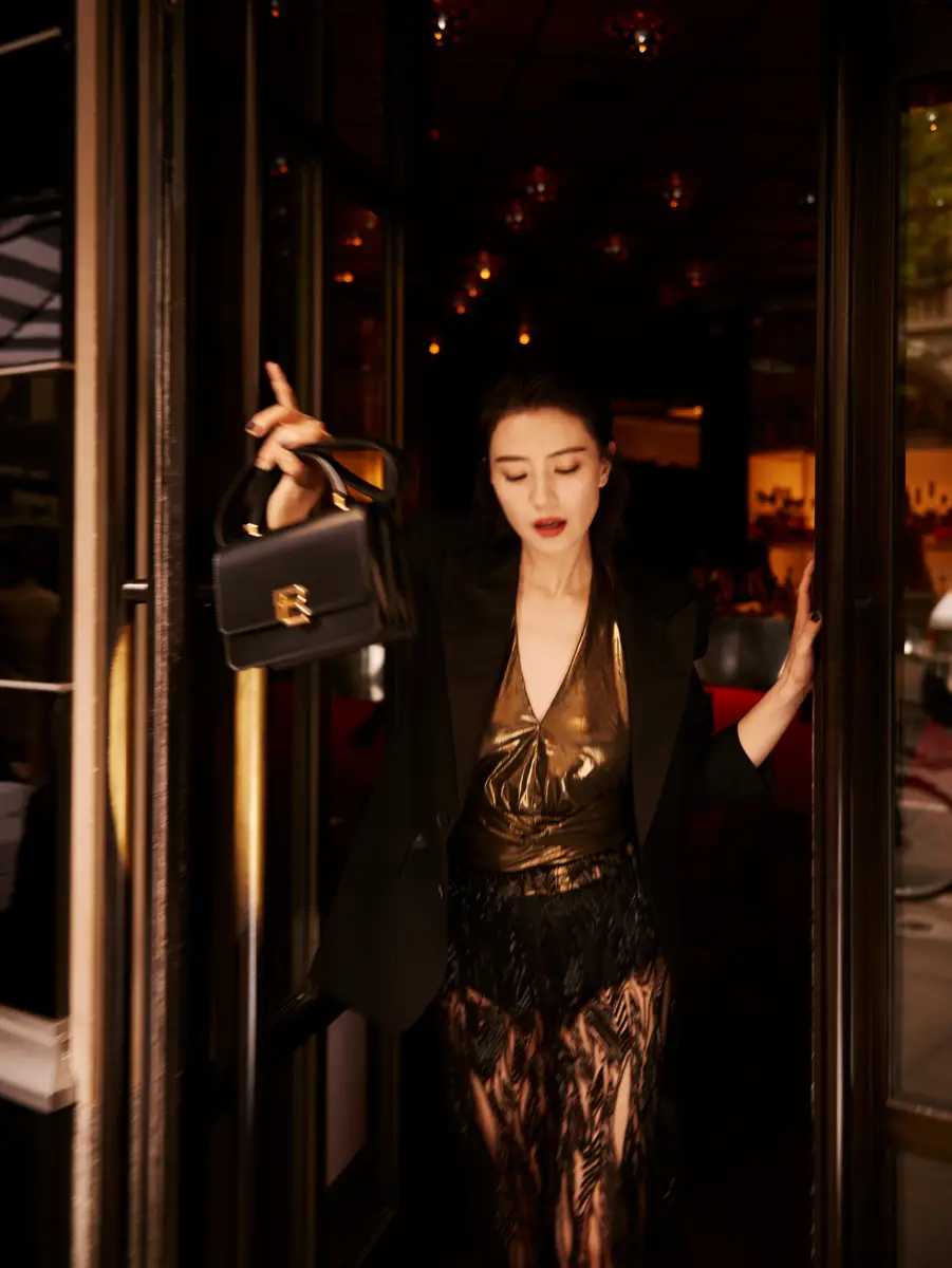 高圓圓做推門手勢(shì),畫面很有故事感。