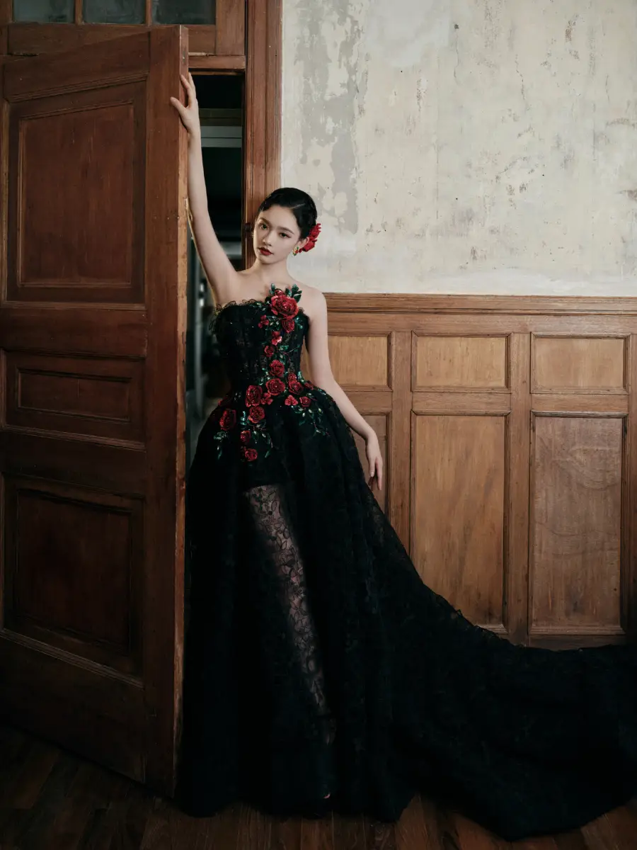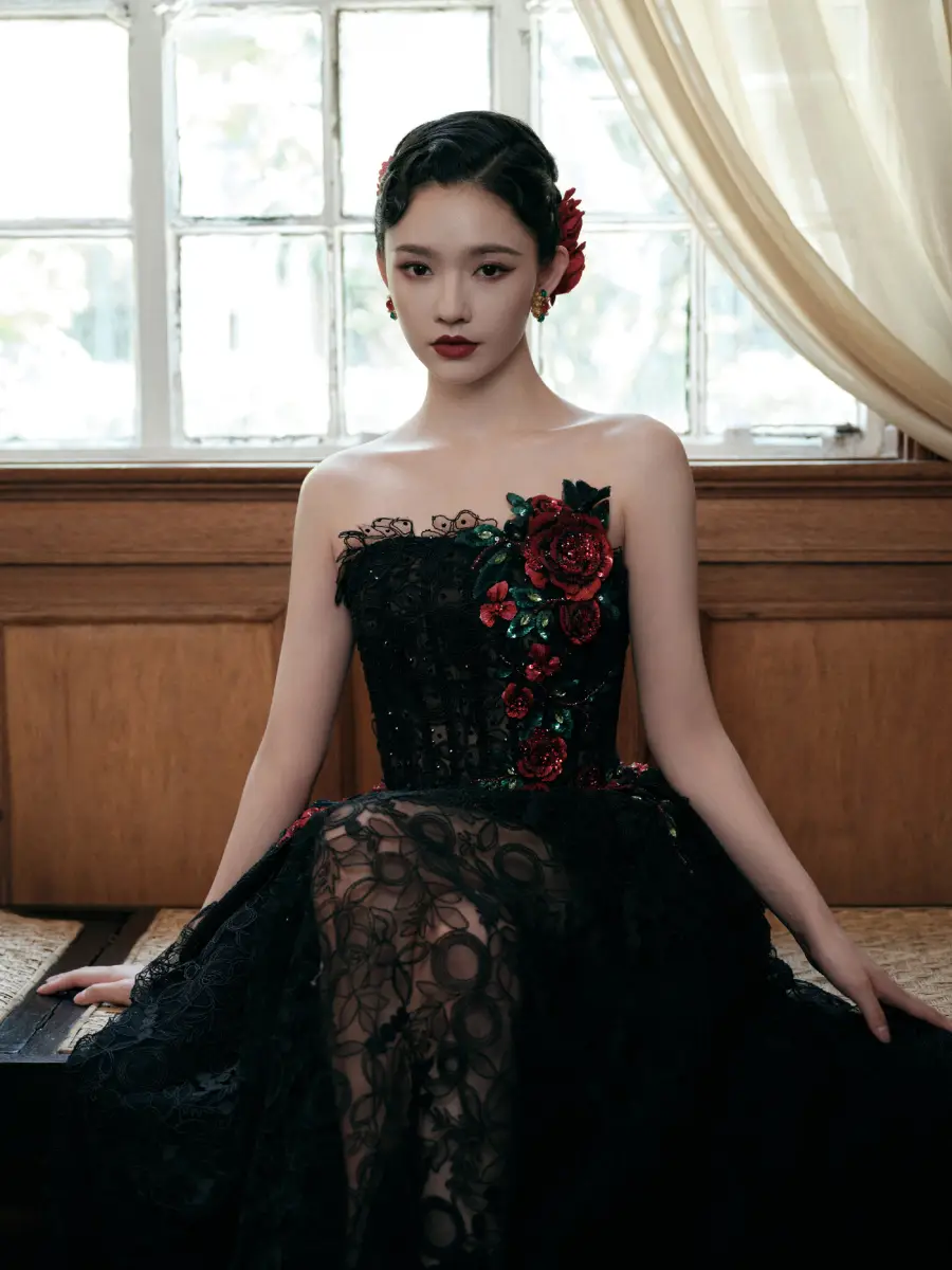 林允穿黑紗玫瑰裙嫵媚迷人 美腿在裙擺中若隱若現(xiàn)