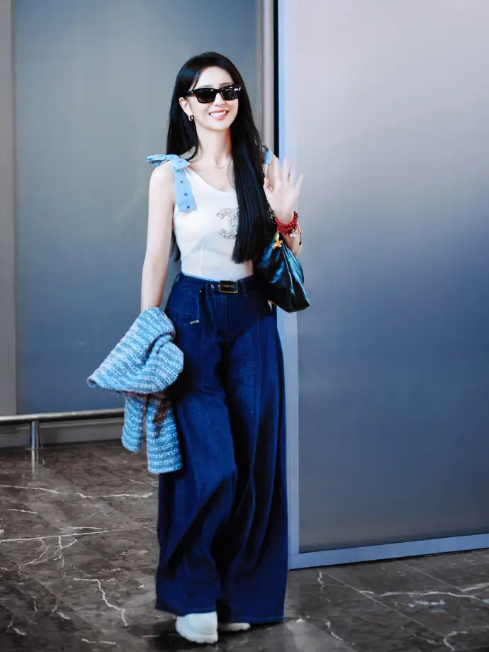佟麗婭穿藍(lán)色吊帶松弛感十足。