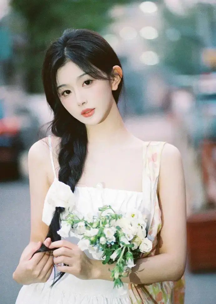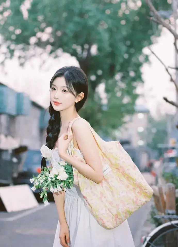 孔雪兒手拿捧花自然清新 麻花辮配白發(fā)圈美麗大方