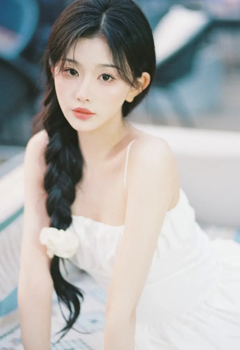 孔雪兒麻花辮配白色發(fā)圈美麗大方。