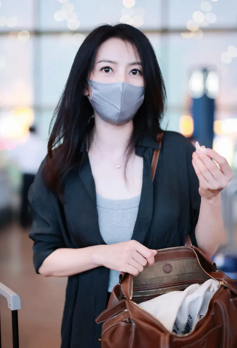 高圓圓著黑色襯衫知性大方 背褐色單肩包簡(jiǎn)約
