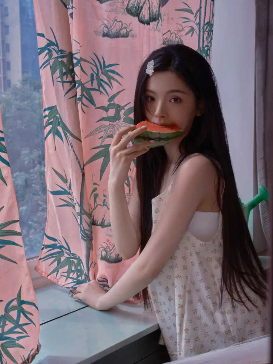 楊超越炎炎夏日穿吊帶睡衣 搖蒲扇吃西瓜可愛甜美