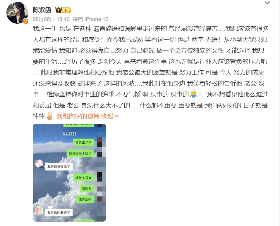 8月6日,陳紫函(明星經(jīng)紀(jì)公司)發(fā)文力挺老公戴向宇,稱自己對(duì)曝戴向宇嫖娼事件,只有兩個(gè)字無語,她表示“這也許就是行業(yè)人應(yīng)該背負(fù)的壓力吧”,同時(shí)表達(dá)了對(duì)老公的理解和心疼,并告訴他沒事:“老公沒事繼續(xù)堅(jiān)持你對(duì)事業(yè)的追求,不要?dú)怵H,啊,沒事的,沒事的!”她還在和朋友的聊天記錄中透露自己心態(tài)對(duì)這件事的心態(tài)很好,并稱自己的老公終于紅了。