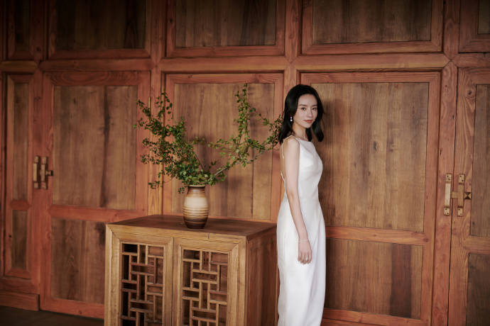 董潔一襲珍珠白裙優(yōu)雅純真 置身古風(fēng)宅院身姿婉約