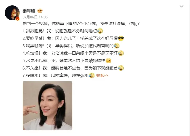 7月6日,秦海璐(明星經(jīng)紀(jì)公司)在個人社交賬號發(fā)文,分享了自己體脂率下降的幾個小習(xí)慣,順便談及了一些家庭生活,秦海璐表示因為要送兒子上學(xué),所以養(yǎng)成了吃早餐的習(xí)慣,她還笑稱因為吃菜喜歡細(xì)嚼...
