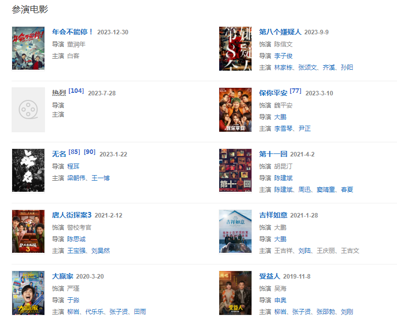 2021125日,特邀領銜主演的都市情感劇《假日暖洋洋》開播;212日,參演的電影《唐人街探案3》上映;35日,出演陳建斌執(zhí)導的電影《第十一回》上映 ;517日,大鵬亮相融創(chuàng)文化戰(zhàn)略布局發(fā)布會,透露自己的新片定名為《一個人的球隊》;99日,主演的的網(wǎng)劇《雙探》播出;參加脫口秀《我的青銅時代》。