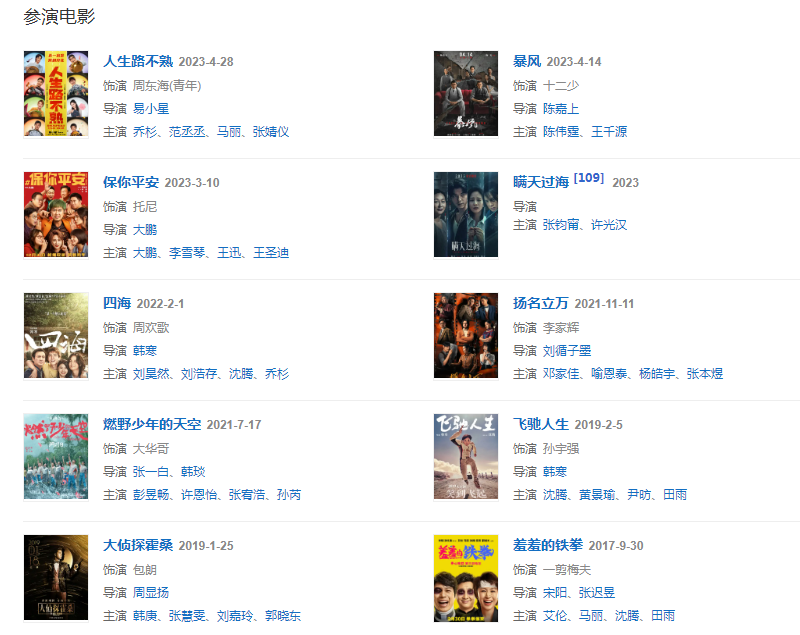 代表作品麻雀、夏洛特?zé)?、他來了,請閉眼、龍門鏢局、鬢邊不是海棠紅、揚(yáng)名立萬