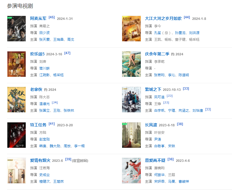 2021年至2023年期間,參演作品《一剪芳華》《你好檢察官》《恩愛兩不疑》陸續(xù)播出。