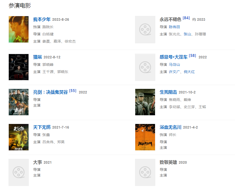 202142日,出演網(wǎng)絡(luò)電影《浴血無名川》定檔。202148日,戰(zhàn)爭歷史電影《生死阻擊》 。202112月,擔(dān)任第32屆華鼎獎(jiǎng)評委。