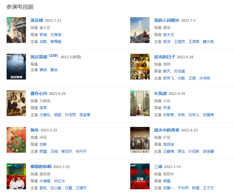 代表作品:大紅燈籠高高掛、血色清晨、頭發(fā)亂了、真情告別、萍蹤俠影、小魚(yú)兒與花無(wú)缺、給婚姻放個(gè)假、新世間路、首付、大丈夫