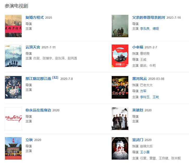 2020年7月8日,主演的大型荒誕懸疑清宮傳奇電視劇《那江煙花那江雨》播出。同年,主演歷史劇《宣武門》 。