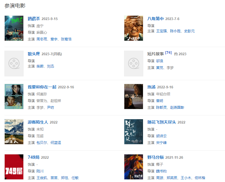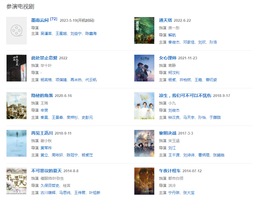 2015年起,相繼拍攝警匪片《解救吾先生》;同年,拍攝青春片《致青春·原來你還在這里》、《萬物生長》、《夏天19歲的肖像》中塑造了多個性格迥異的少女形象,靈氣十足、個性執(zhí)著也成為其突出的銀幕標簽。 。